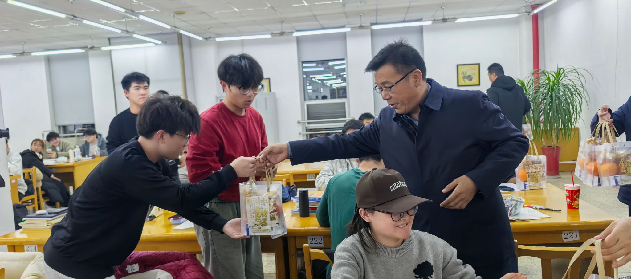 为激励考研学生坚定信心,全力以赴备战考研初试,12月10日晚,党委常委、副校长郑利军,学生工作处处长陈德翼,图书馆馆长艾华和学生工作处全体工作人员到图书馆自习室和文思楼考研教室开展考研慰问活动,为同学们送上考研祝福和暖心大礼包。