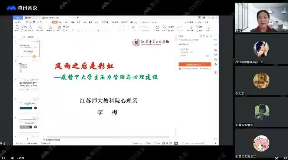 为进一步做好疫情期间大学生心理健康教育,帮助学生缓解校园封闭管理产生的压力与焦虑。4月27日下午三时,由学生工作处主办、文法学院承办的“风雨之后是彩虹——疫情下大学生压力管理与心理建设”专题线上讲座顺利开展,主讲嘉宾为江苏师范大学教科院心理系李梅教授,校心理健康中心全体老师、文法学院党委副书记王国银、全体辅导员及全校各学院的学生参加了讲座,活动由文法学院院长吴明忠主持。
