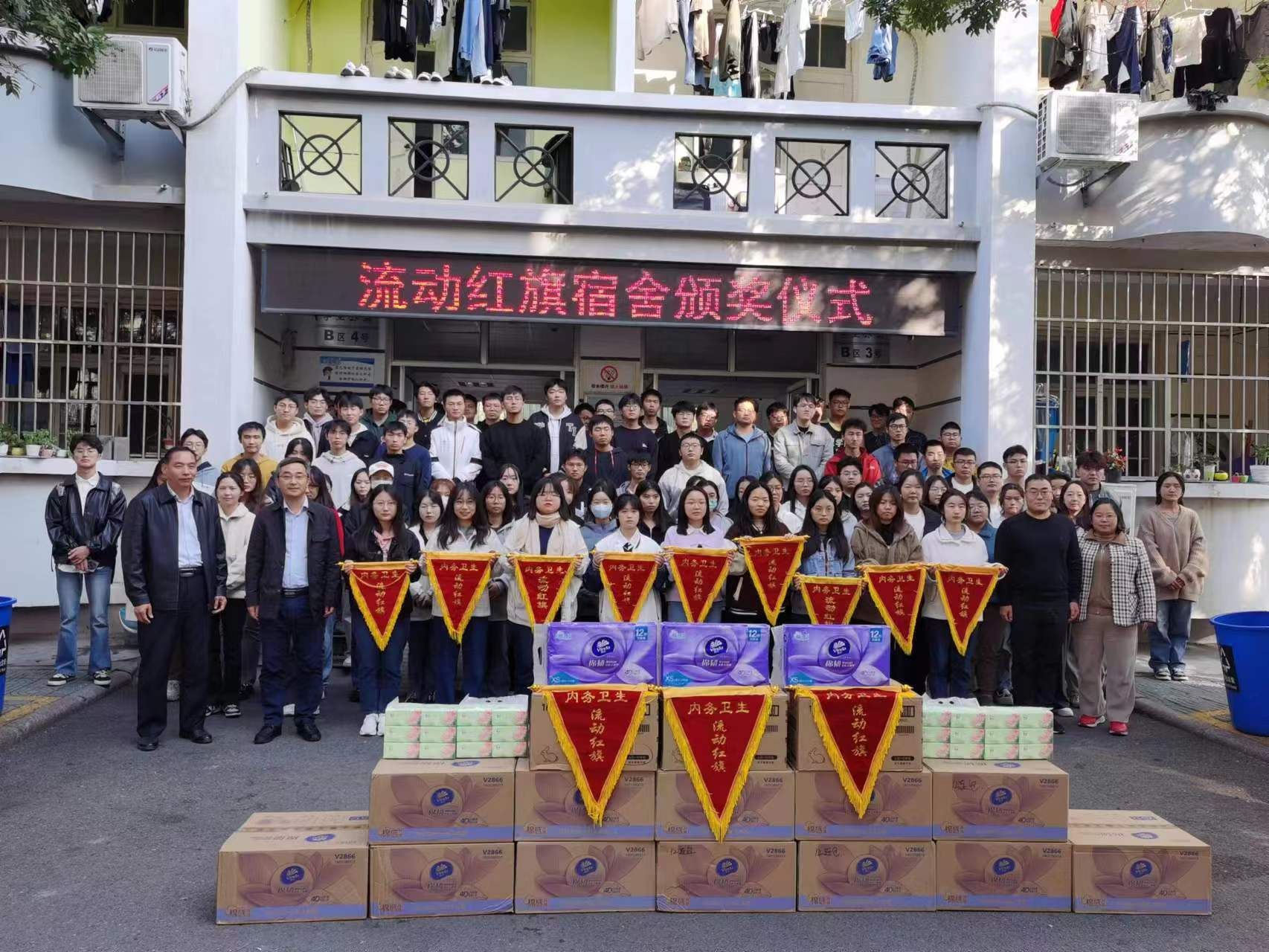 “流动红旗”宿舍标志着宿舍集体的努力成果,它的意义在于“流动”,寓意荣誉称号在各个学生宿舍内流动,在学生社区形成你追我赶、奋勇争先的良好氛围。颁奖结束后,参会学生参观“流动红旗”宿舍,相互交流宿舍内务整理经验。