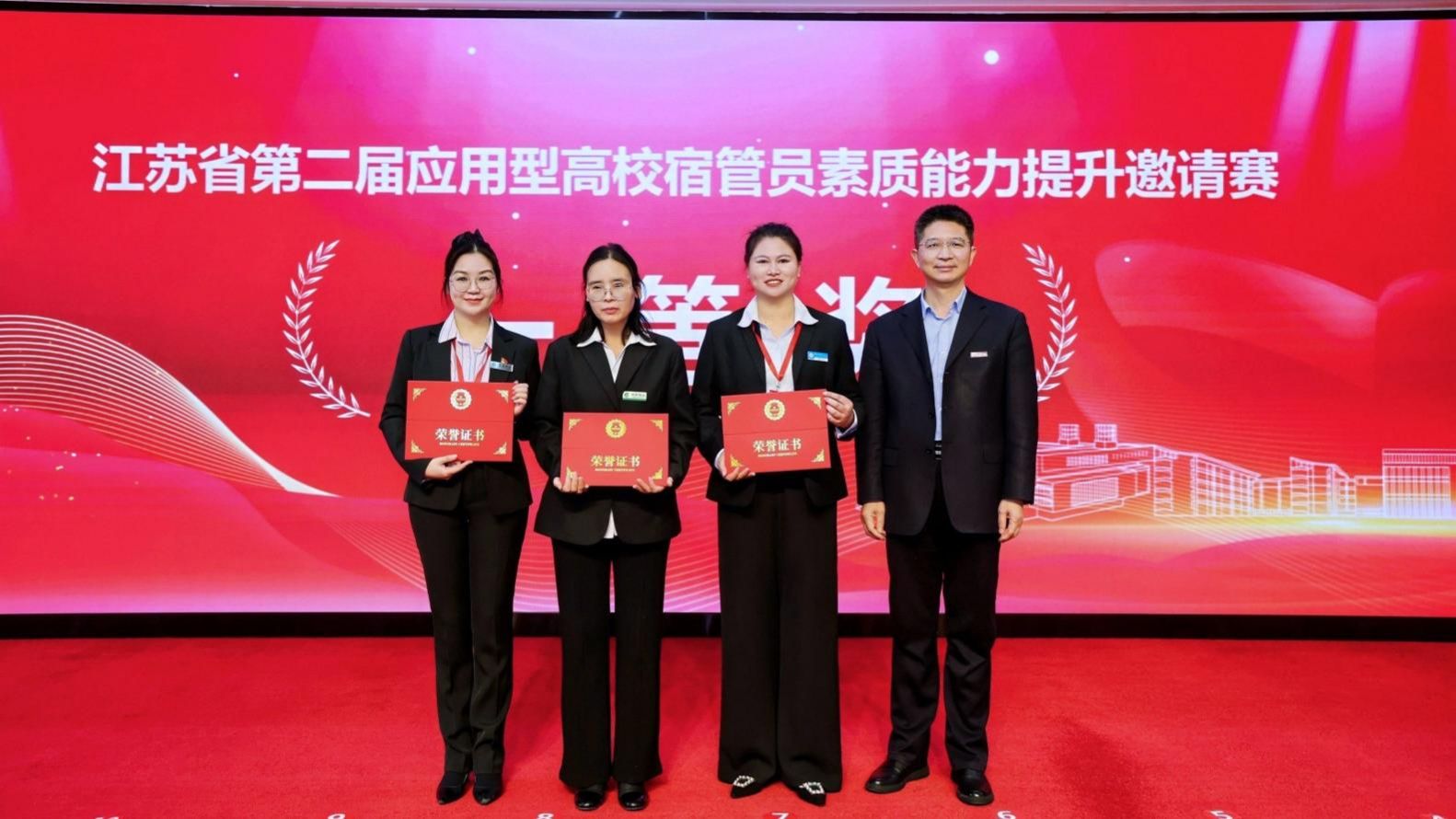 12月17日,由江苏省应用型高校“一站式”学生社区共建联盟主办的第二届应用型高校宿管员素质能力提升邀请赛,在南京工程学院顺利闭幕。我校苍梧校区学生宿舍A6楼宿管员杨守梅以扎实专业的职业素养、丰富的实践经验,过关斩将、奋勇拼搏,最终以总分90.67荣获一等奖。赛前,学生工作处副处长张志浩参加江苏省应用型高校“一站式”学生社区共建联盟成立启动仪式。