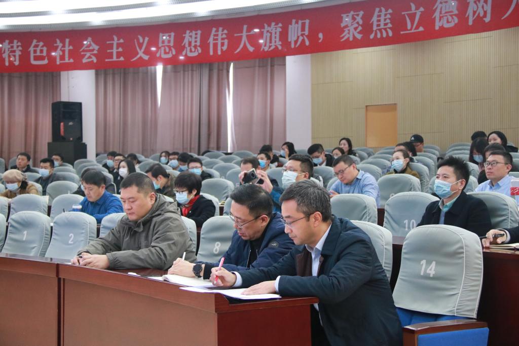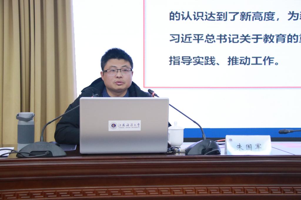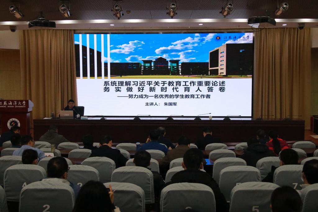 12月3日下午,校党委常委、副校长朱国军在会议中心黄海厅讲授题为“系统理解习近平关于教育工作重要论述,务实做好新时代育人答卷——努力成为一名优秀的学生教育工作者”专题党课。各学院党委副书记、辅导员,学生工作处、团委、招生与就业处全体成员,保卫处、党委研工部的领导聆听了党课。