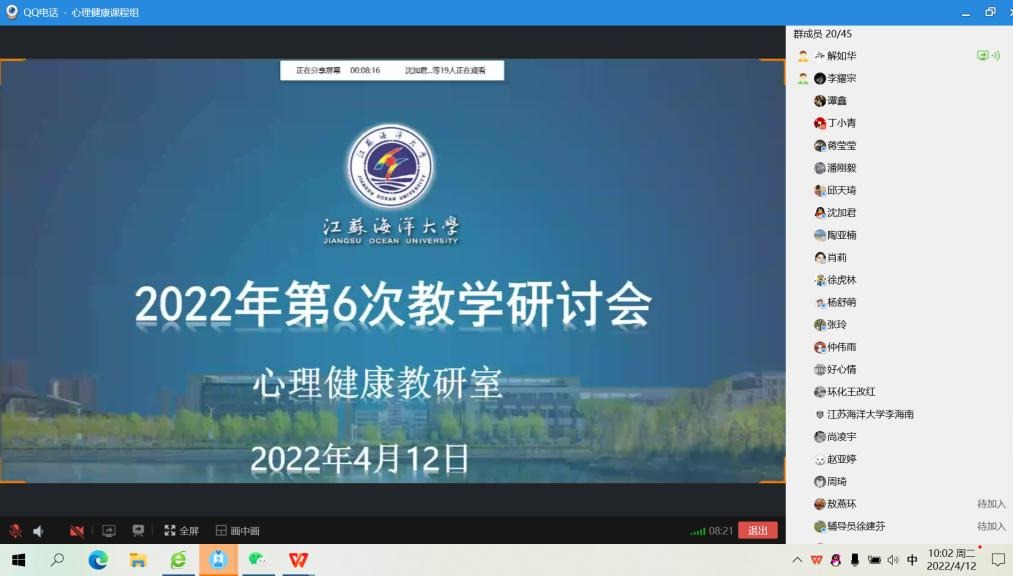 在本轮疫情爆发之初,心理健教研室就及时调整教学进程,将情绪调控和压力管理专题迁移,助力学生在特殊时期的心理成长。为进一步加强《大学生心理健康》课程建设,不断提升课堂教学的时效性,学工工作处心理健康教研室在3月31日和4月12日组织开展了两次集体备课,全体任课教师参加了备课会。