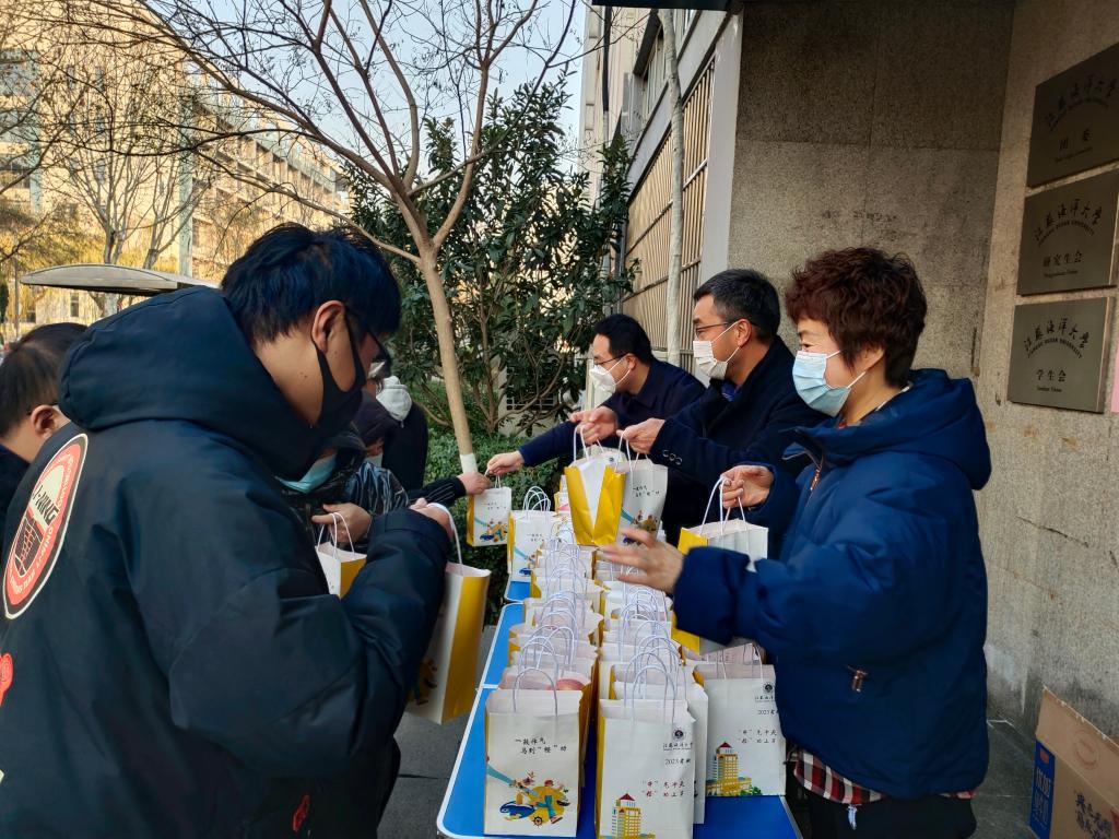 早在班级群里预热过了,接到消息的同学们,趁着起身活动的功夫,纷纷组团来到大学生活动中心,领取考研专属大礼包。老师们一边将考研礼包递给学生,一边鼓励大家“祝你们考研顺利!已经到冲刺阶段了,吃点水果补充维生素,注意做好个人防护。一定要放平心态,考出理想的成绩!”同学们拿到沉甸甸的礼包,禁不住笑着感叹:“这么大的红苹果!今天太有福气了。谢谢老师!”你来我往间的话语,诙谐幽默的语言和热情轻松的氛围,不禁让这份冬天的暖意,流淌在现场每一个师生的心间。