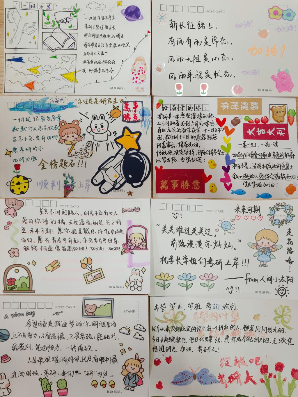 为给同学们准备好这份暖心礼包,辅导员纷纷自发撸起袖子,分工合作将新采购的牛奶和苹果拆封、分装、搬运上车,干得热火朝天。学弟学妹们也齐齐上阵,在亲手制作的明信片上一笔一划地写上“星光不负赶路人,你定会在清晨的读书声里和深夜的灯光下,实现自己的梦想。考研之路道阻且长,明天定会迎来胜利的曙光!”“关关难过关关过,前路漫漫亦灿灿。祝学长学姐们考研上岸”“优秀从来没有既定的样子,每一个拼命的人,都是闪闪发光的。希望学长学姐考研顺利!”温馨的画,温暖的字,无不鼓励着每一位考研学生。