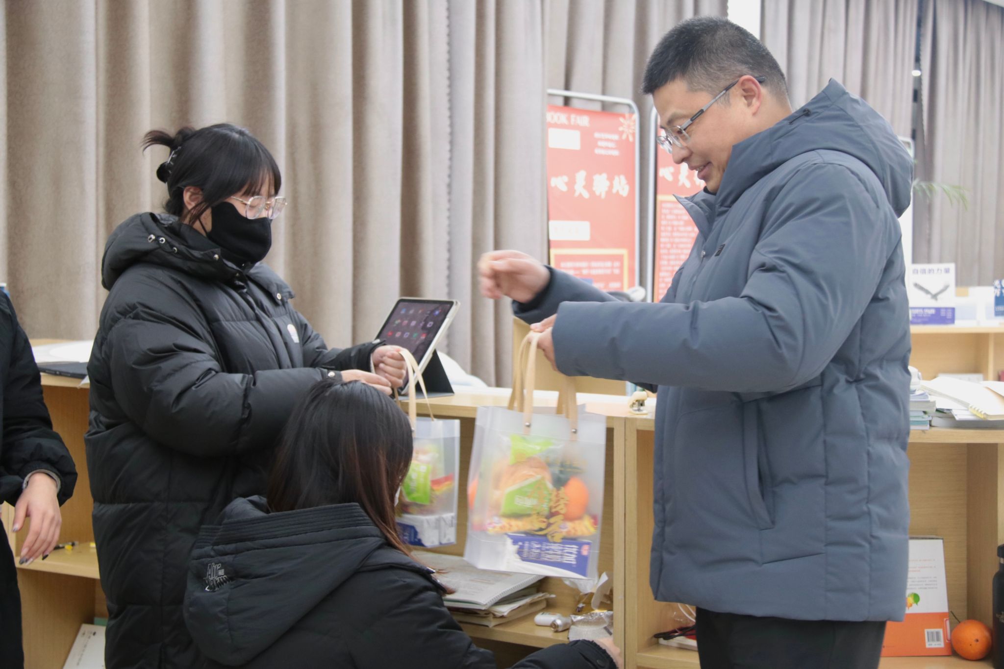 虽是周五下午,图书馆和考研教室里满满都是复习备考的学生,大家一边紧张复习着,一边期待着能收到一份承载着祝福与期盼的暖心礼包。
