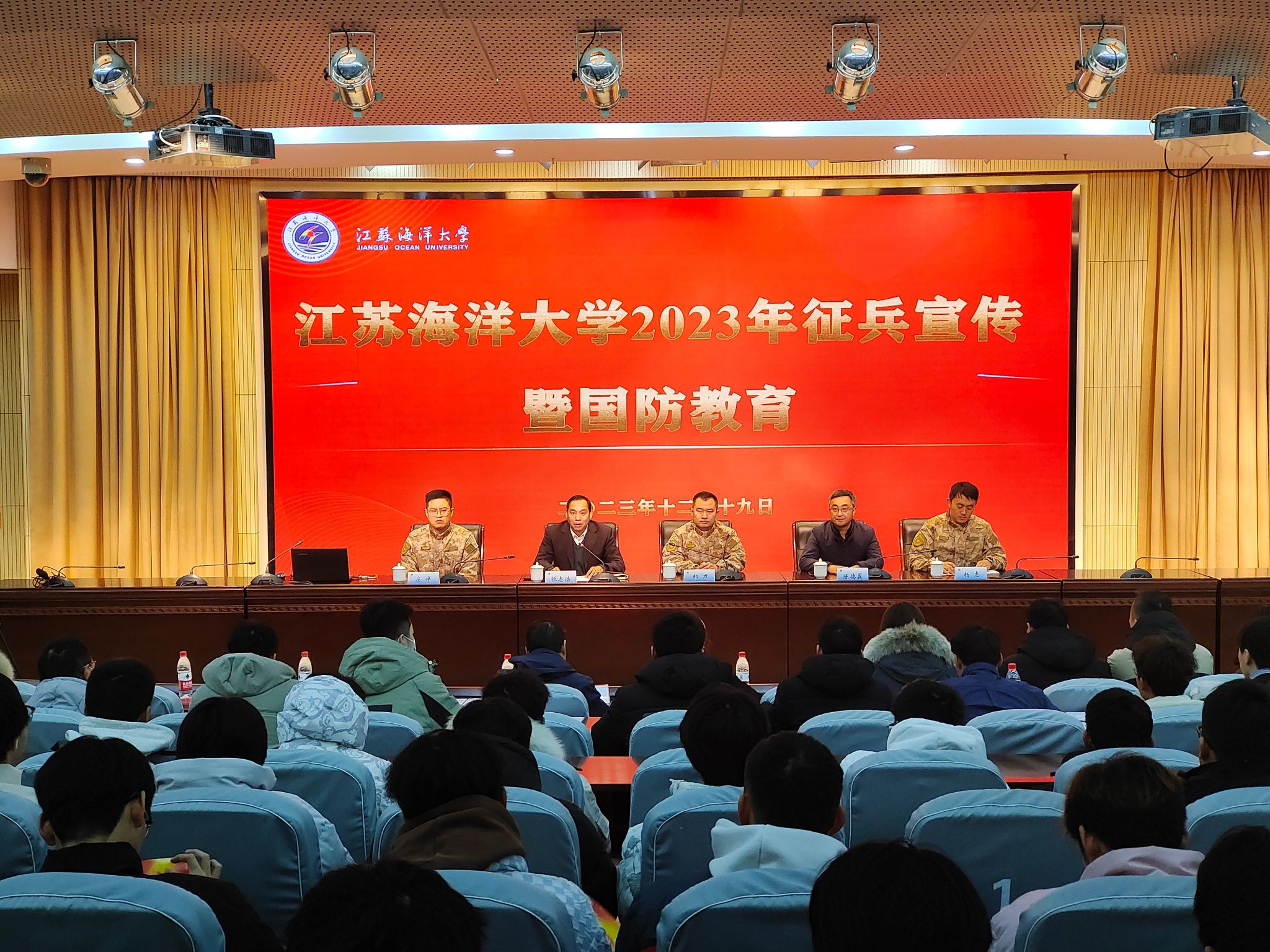 为加强国防教育,号召广大青年积极投身国防建设,12月19日下午,我校在会议中心黄海厅举行征兵宣传暨国防教育活动。海州区委常委、区人武部政委郝力,校人民武装部部长陈德翼,区人武部政治工作科科长杨志,区人武部军事科参谋庄洋出席活动。各学院征兵辅导员、有意向入伍的学生代表参加活动。活动由校人民武装部副部长张志浩主持。
