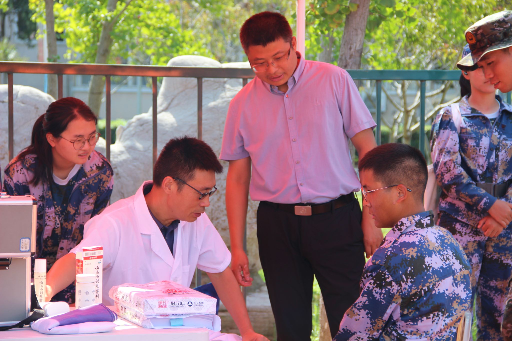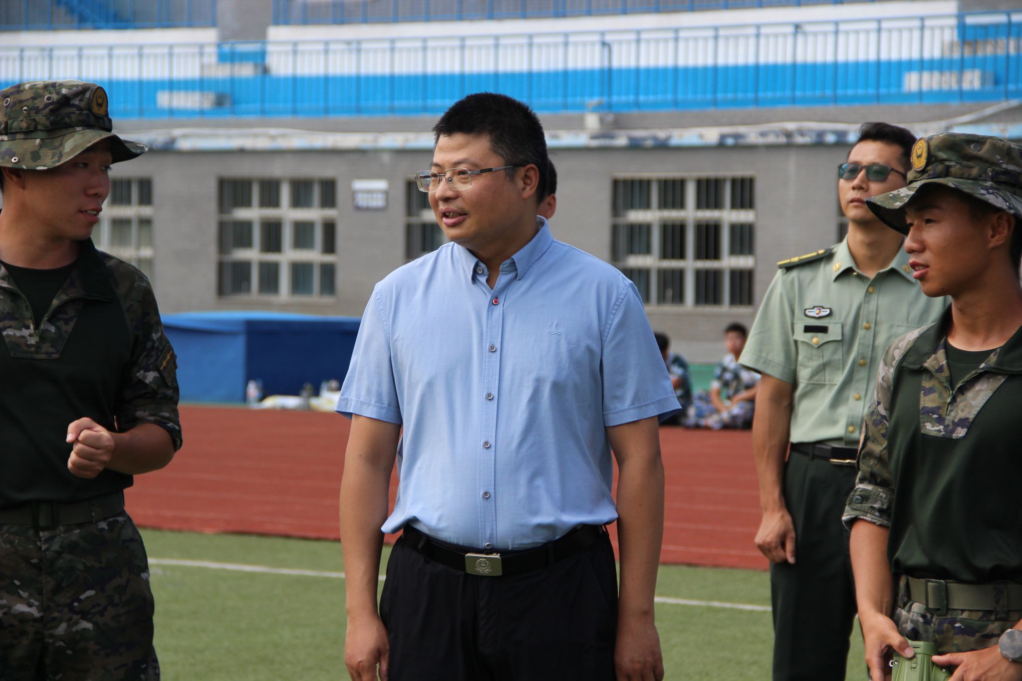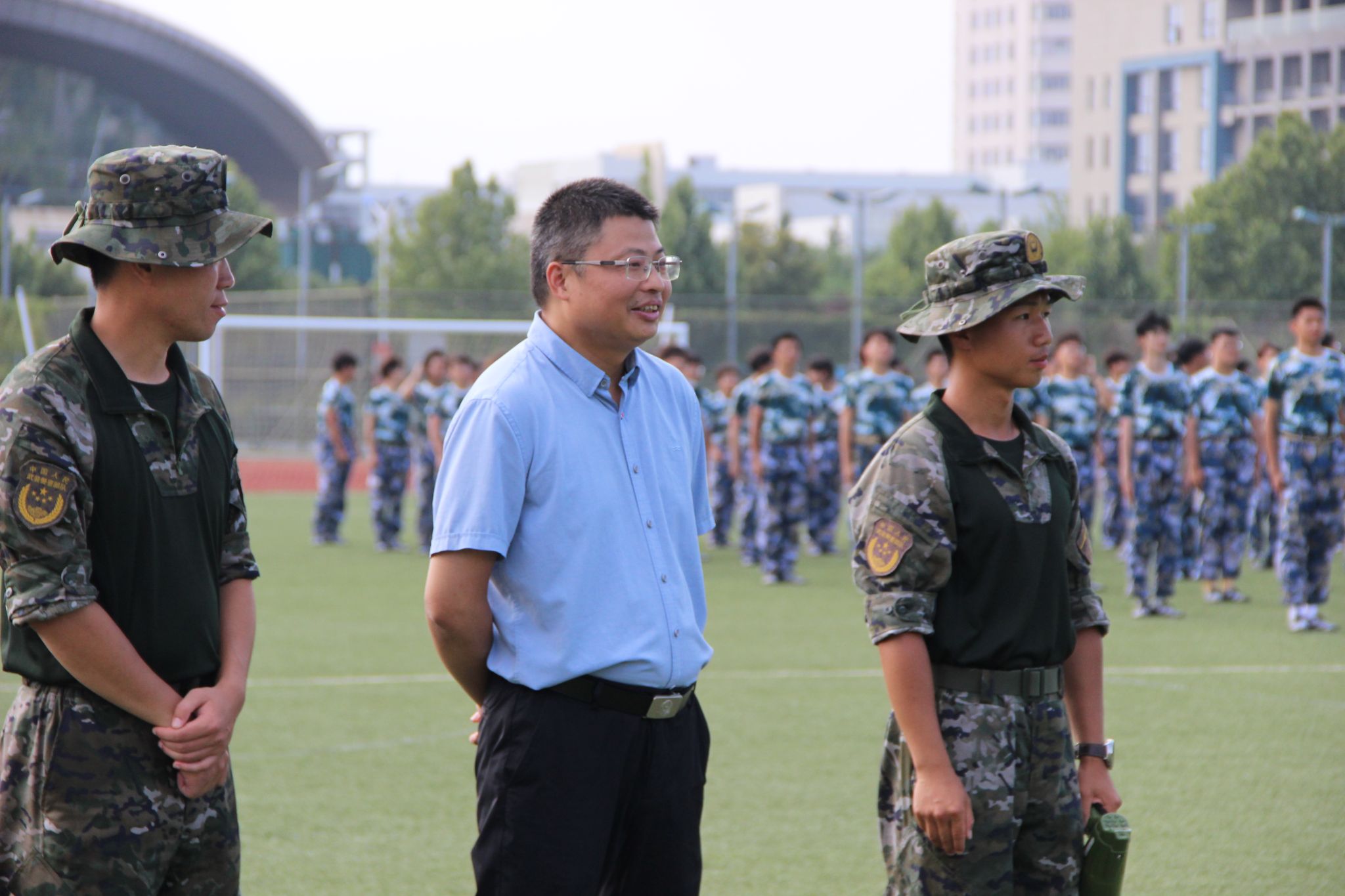朱国军与各学院副书记、军训指导员、医疗保障人员进行交流,仔细了解现场保障情况和新生入学教育开展情况,提醒大家做好军训期间安全工作。他强调,中秋在即,各学院要开展各类联谊活动,关心关爱学生,和学生共度中秋佳节,并以此为契机开展新生入学教育,增强同学们的家国情怀和国防观念。