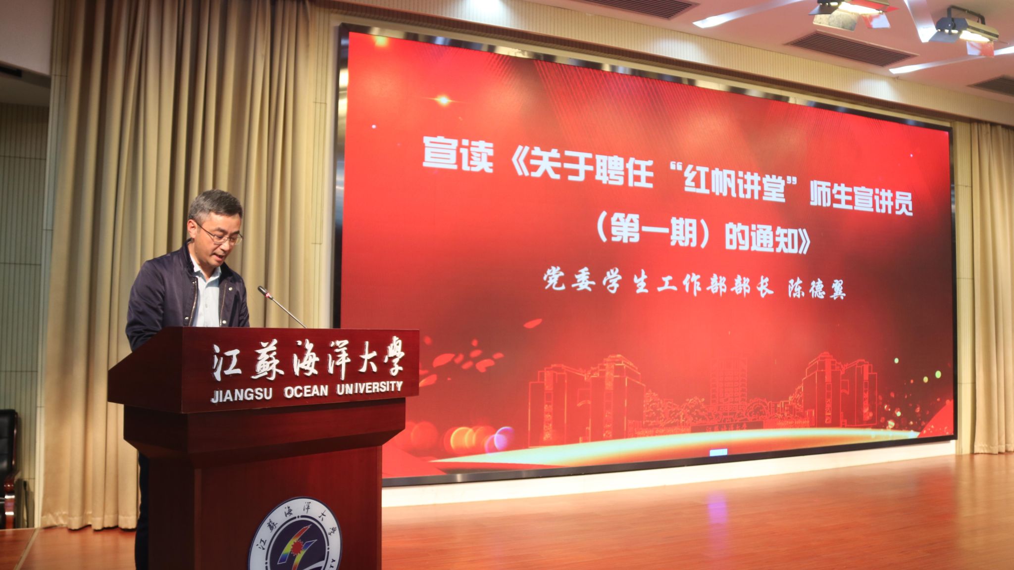 校党委常委、宣传部部长王波宣读《关于公布江苏海洋大学“一站式”学生社区“一院一品”项目验收终评结果的通知》,党委学生工作部部长陈德翼宣读《关于聘任“红帆讲堂”师生宣讲员(第一期)的通知》,为与会嘉宾颁发获奖证书及宣讲员聘书。