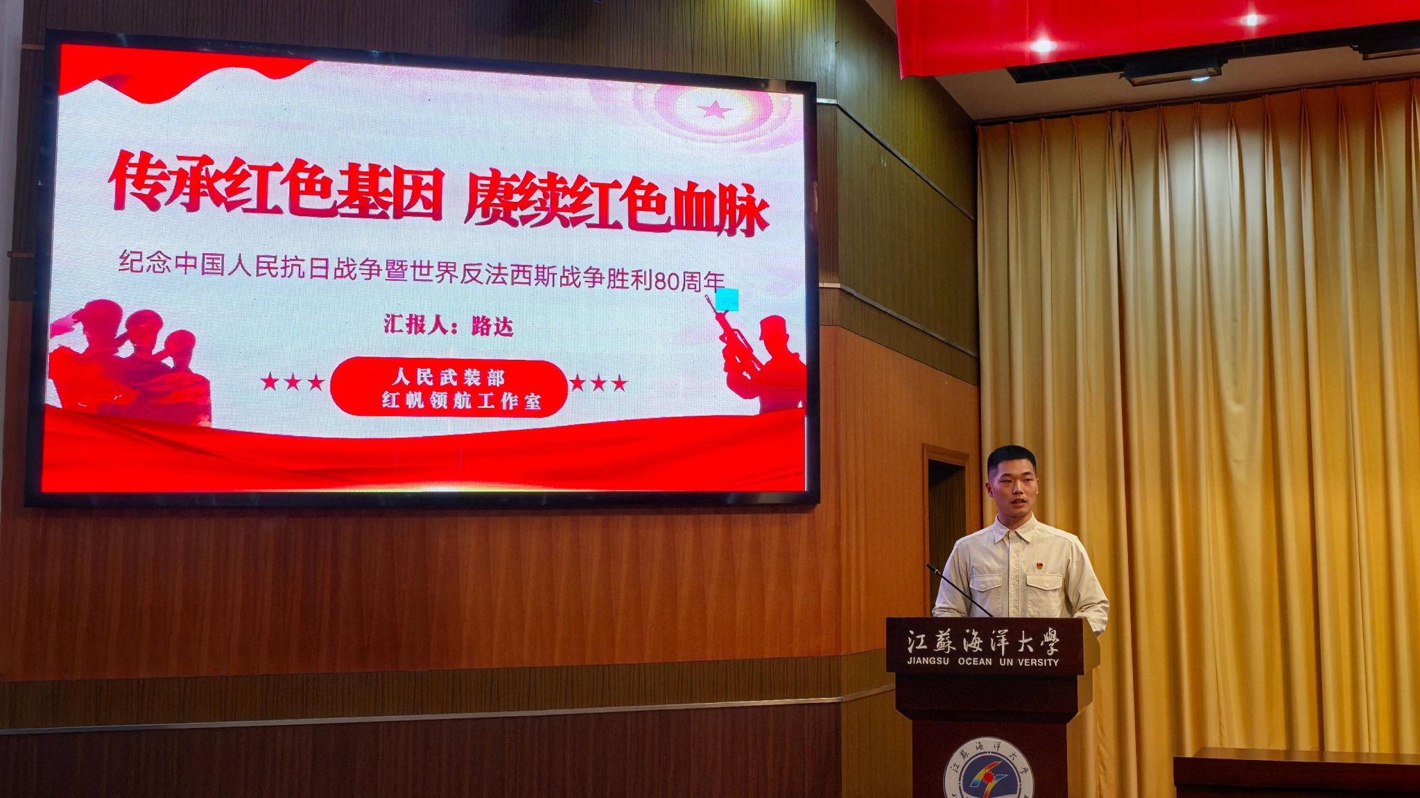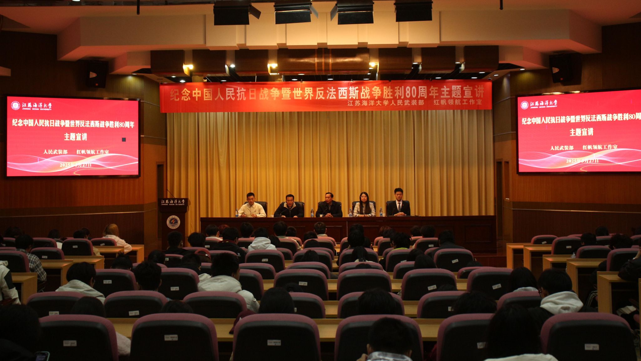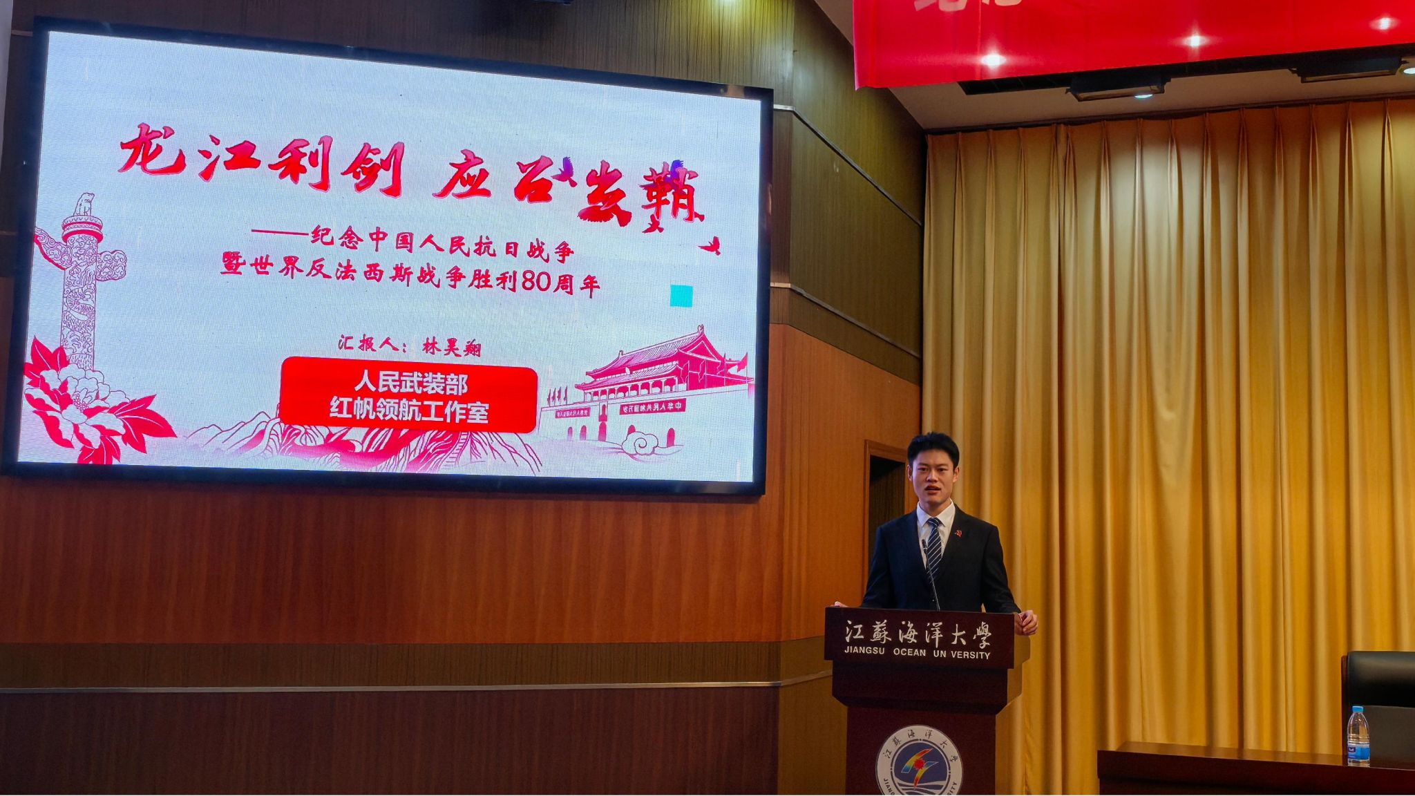 为纪念中国人民抗日战争暨世界反法西斯战争胜利80周年,弘扬伟大抗战精神,传承红色基因,激发青年学生的爱国情怀,3月27日晚,由人民武装部主办、“红帆领航”辅导员工作室承办的纪念中国人民抗日战争暨世界反法西斯战争胜利80周年主题宣讲在文博楼报告厅举行。人民武装部副部长张志浩、国防教育科负责人仲伟雨、文法学院退役大学生林昊翔、应用技术学院退役大学生路达、各学院近200名学生代表参加活动。活动由“红帆领航”辅导员工作室负责人苏成兄主持。
