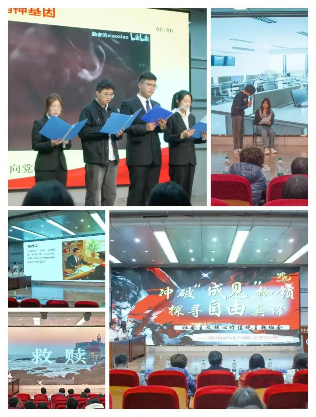 海洋食品与生物工程学院生工1241班分享诚信老人陈月英的事迹,分析诚信缺失的负面影响,强调诚信在个人成长与社会发展中的重要性。药学院制药1241班演绎情景剧《最后一次演讲》,讲述闻一多先生的爱国事迹,弘扬爱国主义精神。商学院国贸1232班以跨境电商主题情景剧《见字如面》打开话题,以“敬以持恒,业以专精”主题,讲述敬业模范的感人故事。应用技术学院财务3232班以爱国为主题,讲述守岛英雄王继才夫妇的故事,激励青年学子为祖国发展贡献力量。马卡洛夫海洋工程学院船舶2242班通过诗歌朗诵《热风》缅怀戍边英雄,激励青年迸发爱国情怀。计算机工程学院网络1242班通过短视频《中国高铁发展史》展示我国经济与科技飞速发展,激励青年为祖国富强贡献力量。电子工程学院海信1231班拍摄短视频《送你一朵小红花》,歌颂生活里平凡的伟大人物,弘扬敬业精神。体育学院休闲1232班以友善为主题,宣传南京义务指路老人事迹,倡导同学们从身边小事做起,传递社会正能量。理学院信息1232班以情景剧《韩冰小课堂》讲解文天祥的《正气歌》,深入探讨诚信与正气的价值,倡导学生以正直的态度面对生活中的每一件事。