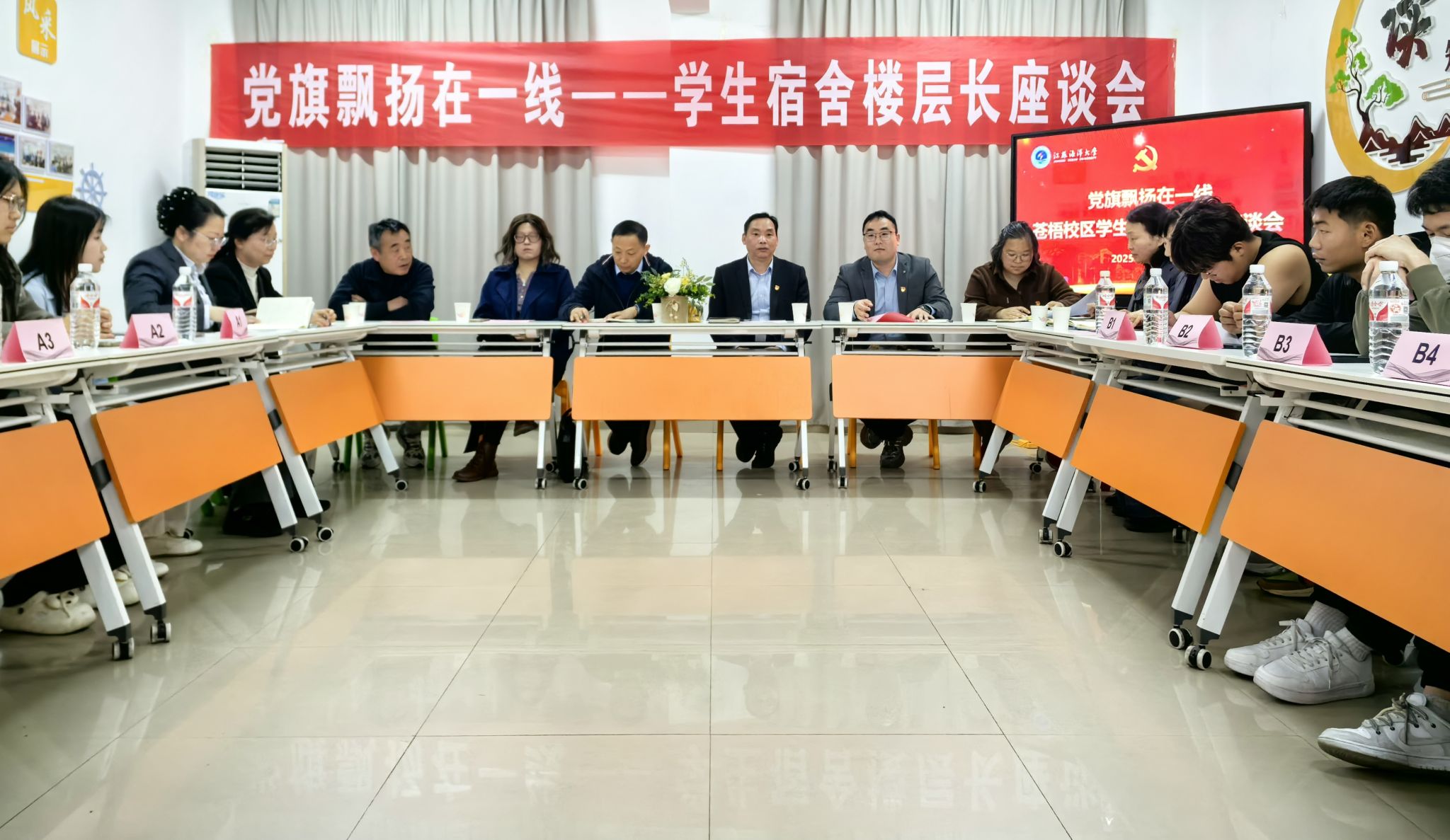 为深入贯彻中央八项规定精神学习教育,切实将作风建设融入学生管理服务一线,学生工作处于4月16日下午组织召开“党旗飘扬在一线”——学生宿舍楼层长座谈会。学生工作处副处长张志浩、后勤与基建管理处副处长许建荣、宿管科和水电中心相关人员出席会议。本次座谈会由宿管科科长马奔主持,学生宿舍楼层长代表、宿舍物业项目部人员及学生自我管理服务中心成员等41人参加。