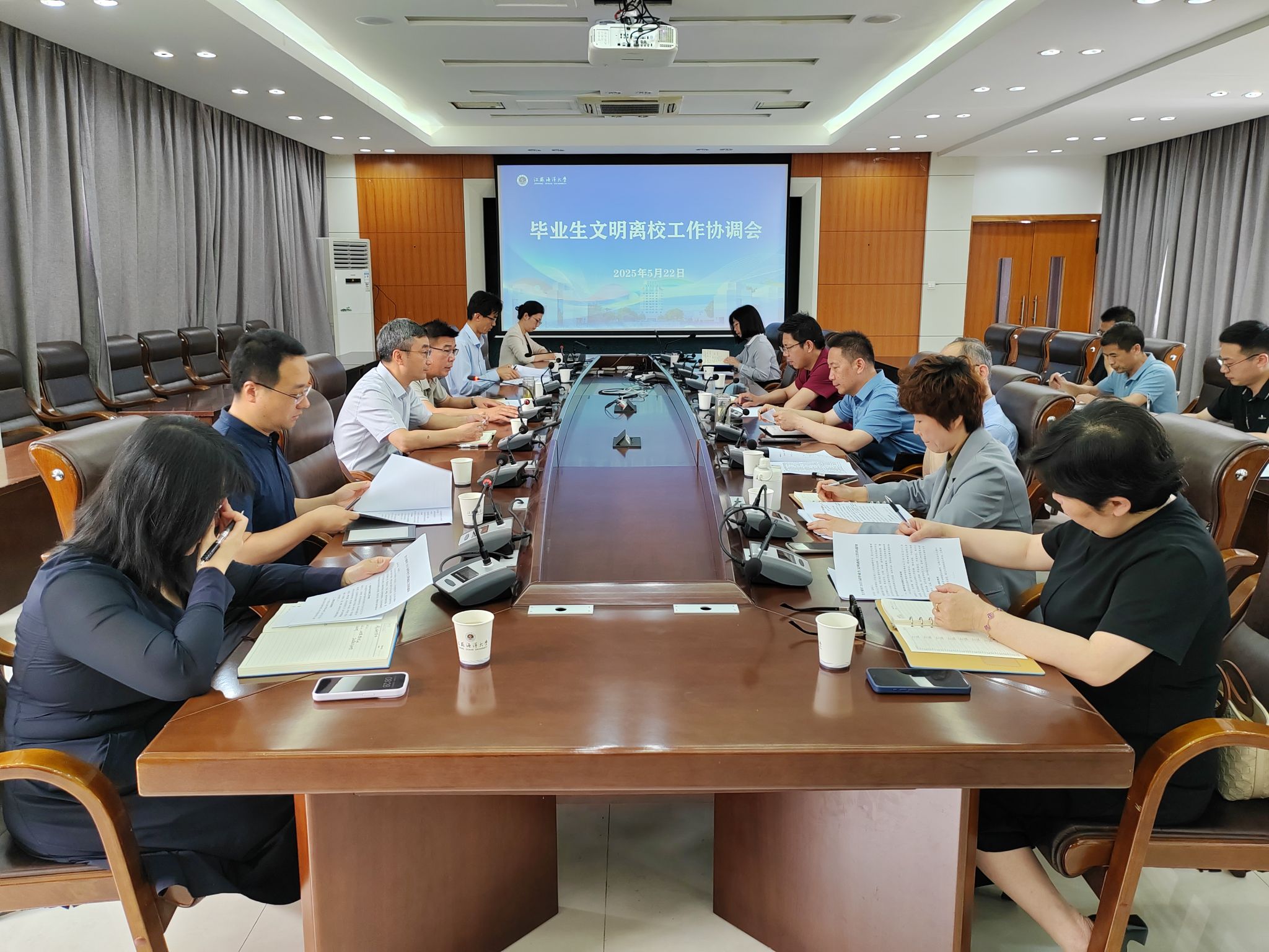 会上,学生工作处作2025届毕业生文明离校工作草案解读,重点介绍毕业生离校工作任务分解、日程安排、手续办理流程等内容。随后,各职能部门负责人对方案做了进一步的补充,并就毕业季校园氛围营造等具体工作内容进行了交流讨论,明确任务分工,确保落实到位。