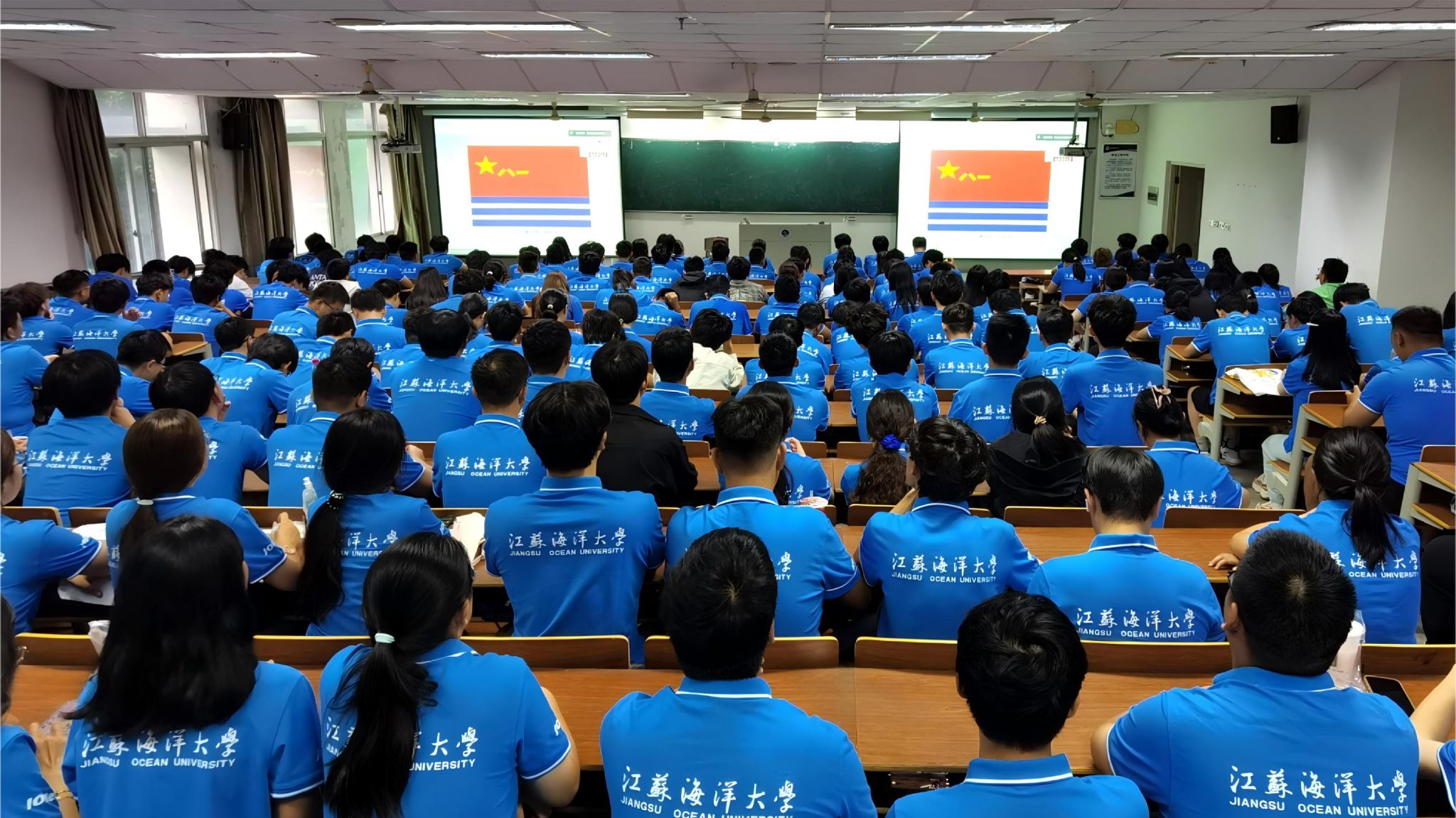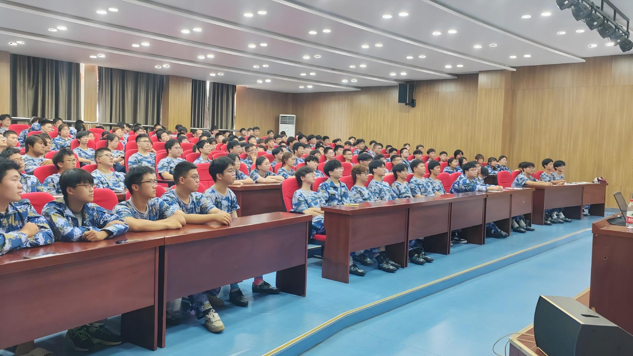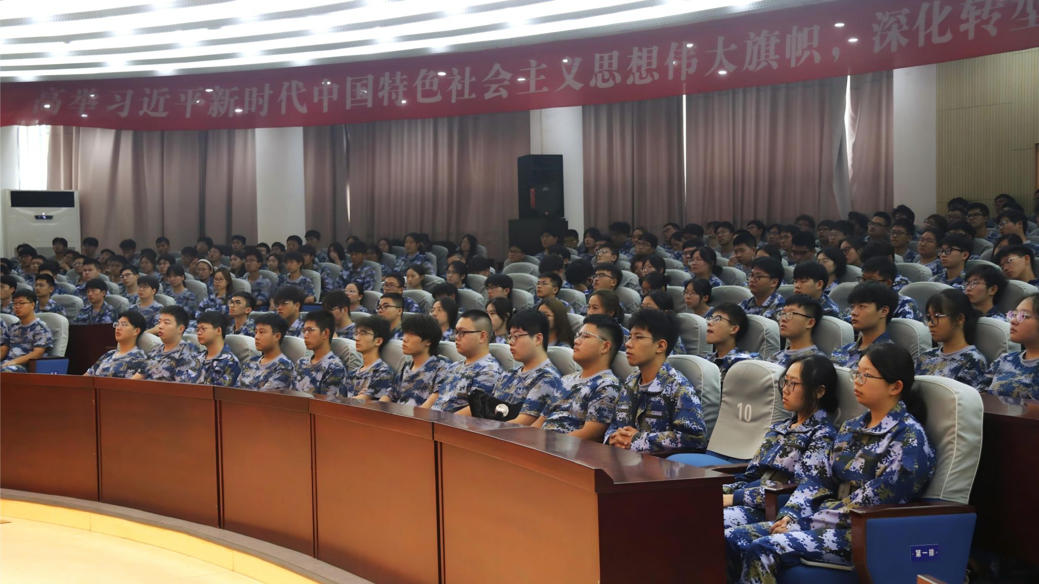 各营连组织军训学员集中观看讲座。