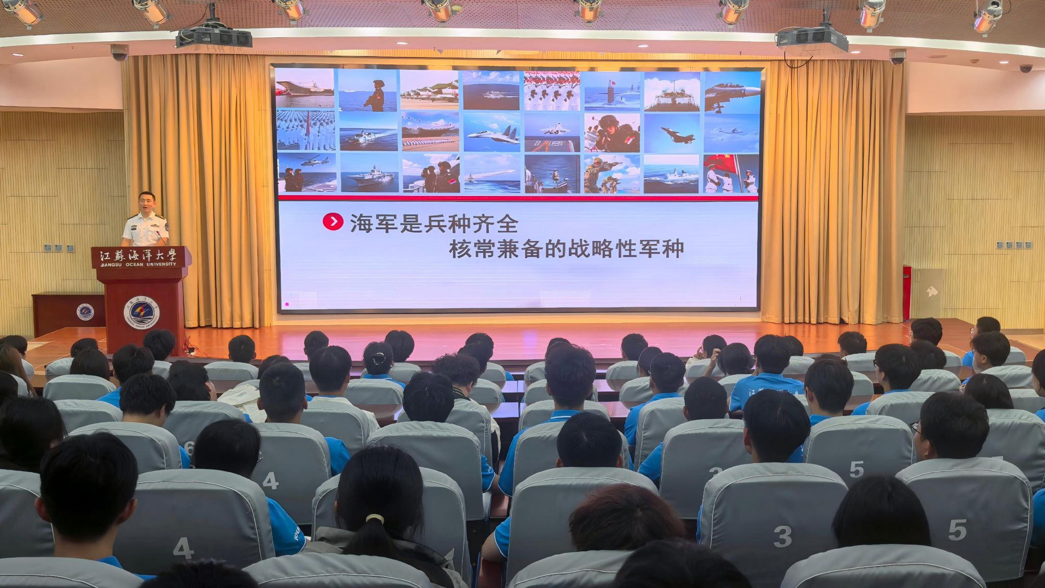 驻连海军某部张涵少校应邀做题为《海军是兵种齐全、核常兼备的战略性军种》专题讲座。张涵从人民海军发展历程讲起,讲述了人民海军处在海上军事斗争第一线、冲在与强敌博弈最前沿、走在维护国家主权安全最前列的生动故事,带给同学们极大震撼。