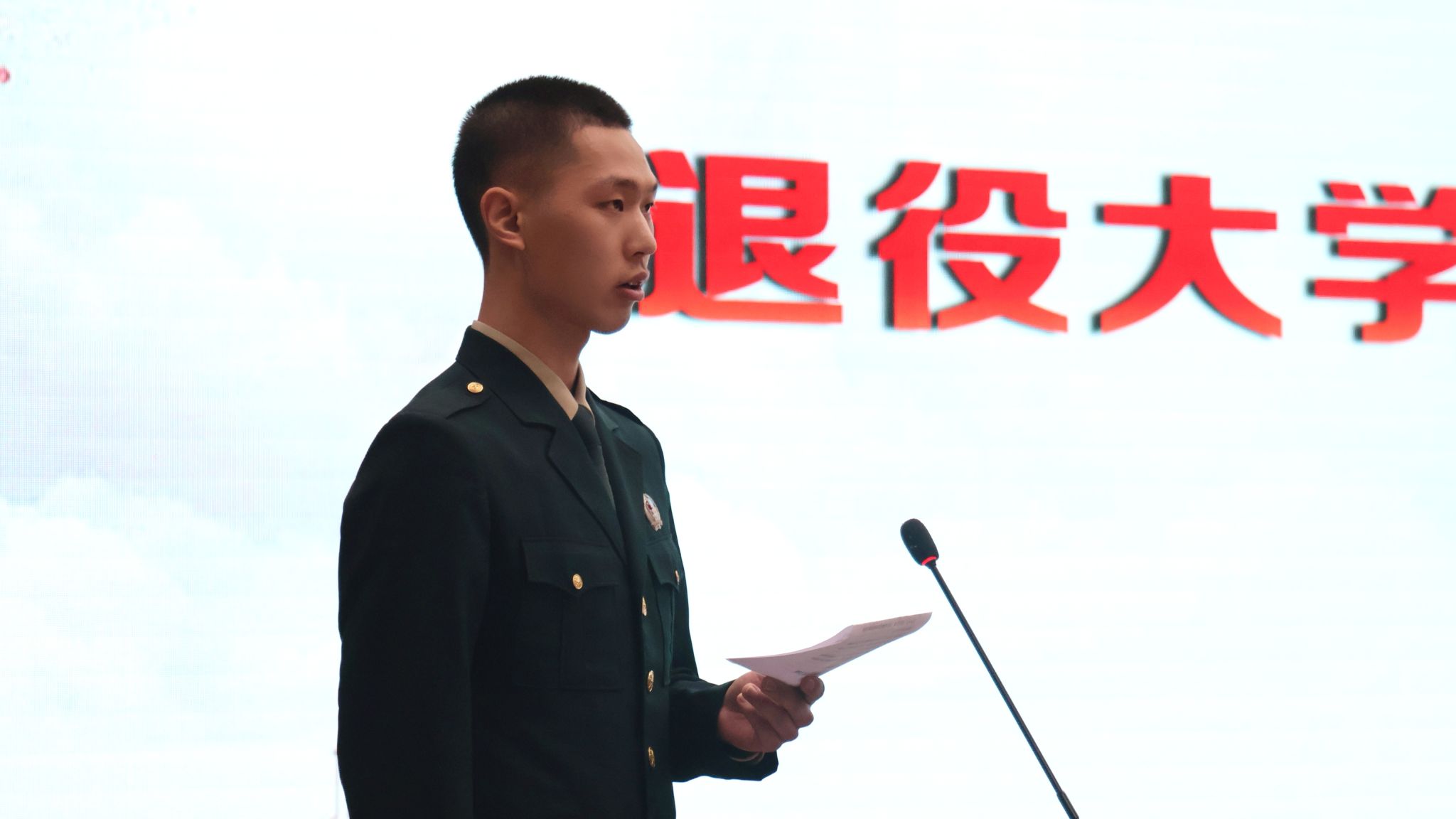 退役大学生代表张钦结合自己的军旅生活,向同学们讲述了在部队中的所学所获,以及脱下军装后的成长与转变。他真诚倡议同学们积极响应祖国号召,走进火热军营,投身强军事业,为社会主义现代化强国建设贡献青春力量。