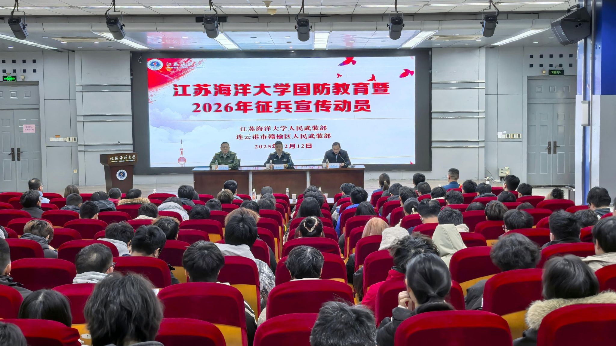 时值第12个南京大屠杀死难者国家公祭日,为铭记历史教训,加强国防教育,号召广大青年积极投身国防建设,校人民武装部联合赣榆区人民武装部在艺术楼报告厅开展国防教育讲座暨2026年征兵宣传动员会议。赣榆区人民武装部政治委员蔡海华、军事科科长代文彬等人员出席会议。各学院毕业班辅导员、有意向入伍的学生代表参加活动。会议由校人民武装部副部长张志浩主持。