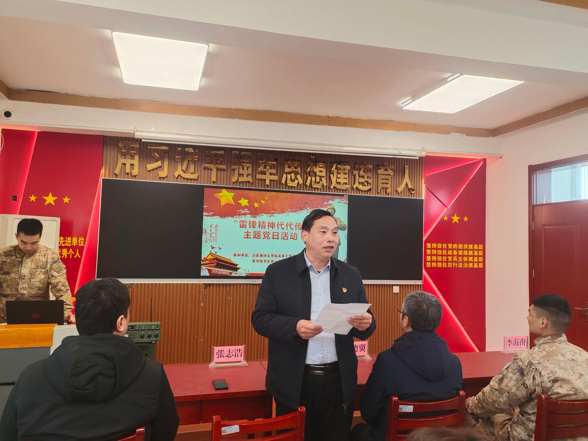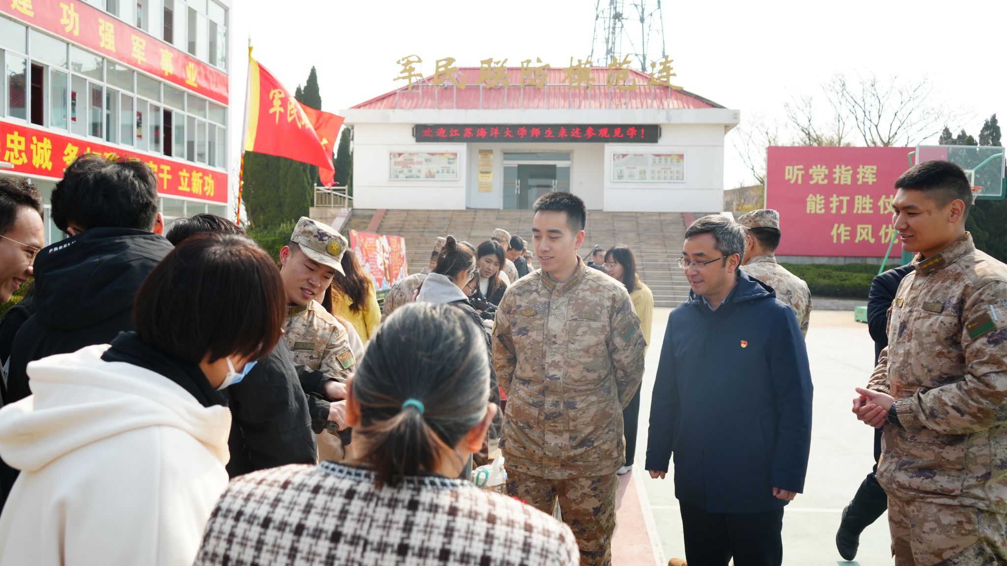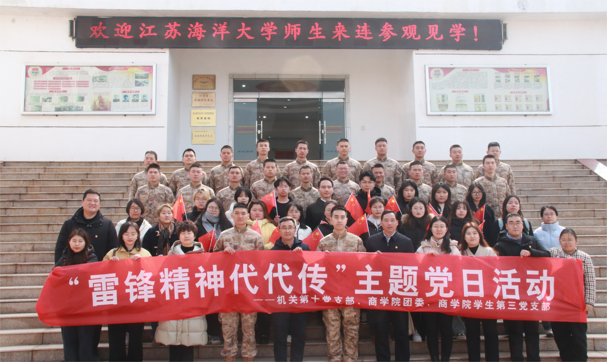 为深入贯彻落实习近平总书记关于弘扬雷锋精神的重要指示精神,继续深化拓展学雷锋活动,3月2日上午,在学习雷锋纪念日前期,我校机关第十党支部、商学院团委、商学院学生第三党支部的师生党员来到“军民联防模范连”31609部队41分队营区进行支部共建,共同开展“雷锋精神代代传”主题党日活动。校人民武装部部长陈德翼、副部长张志浩,校机关第十党支部、商学院团委、商学院学生第三党支部的师生党员共同参加活动。31609部队41分队连长李建、政治指导员凌奕晖及全体官兵热情接待了参加见学的师生。