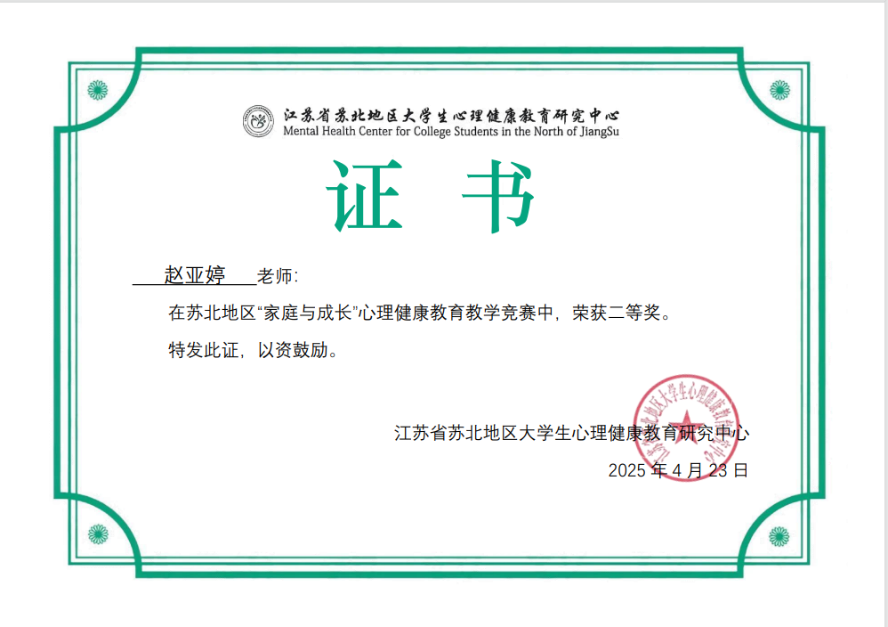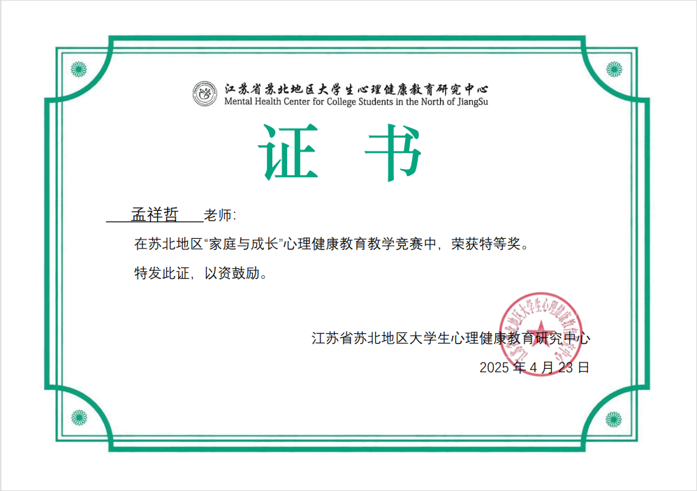 4月27日,从苏北地区大学生心理健康教育研究中心获悉,心理健康教研室教师孟祥哲和赵亚婷在苏北地区高校“家庭与成长”心理健康教育教学竞赛中分别获得特等奖和二等奖。