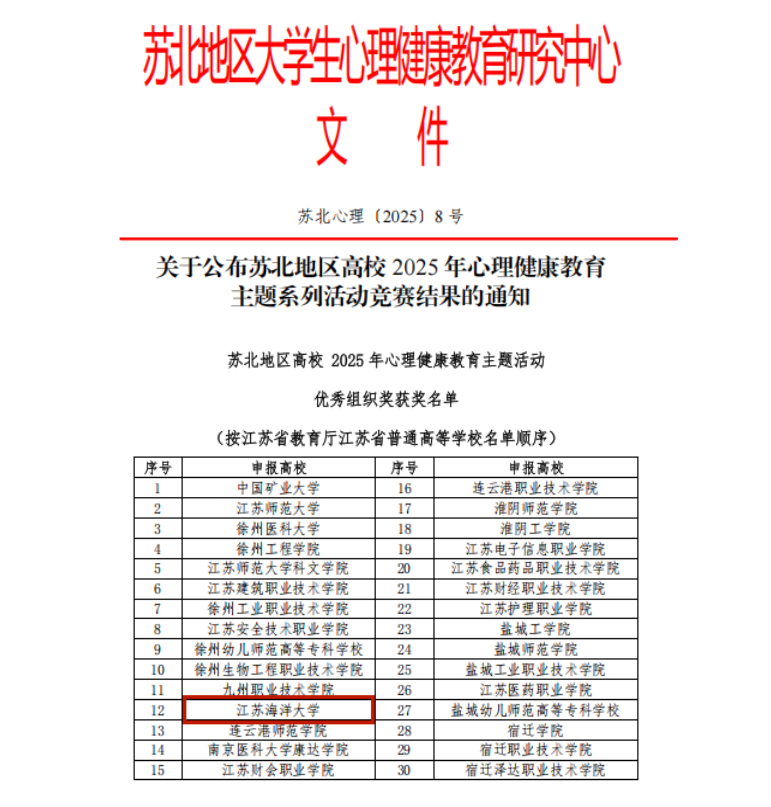 近日,苏北地区大学生心理健康教育研究中心公布了《关于公布苏北高校2025年心理健康教育主题系列活动竞赛结果的通知》。我校在多项赛事中表现优异,荣获一等奖6项、二等奖5项、三等奖5项,并获评“优秀组织奖”,展现出我校在心理健康教育工作中的丰硕成果。