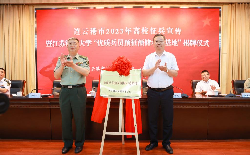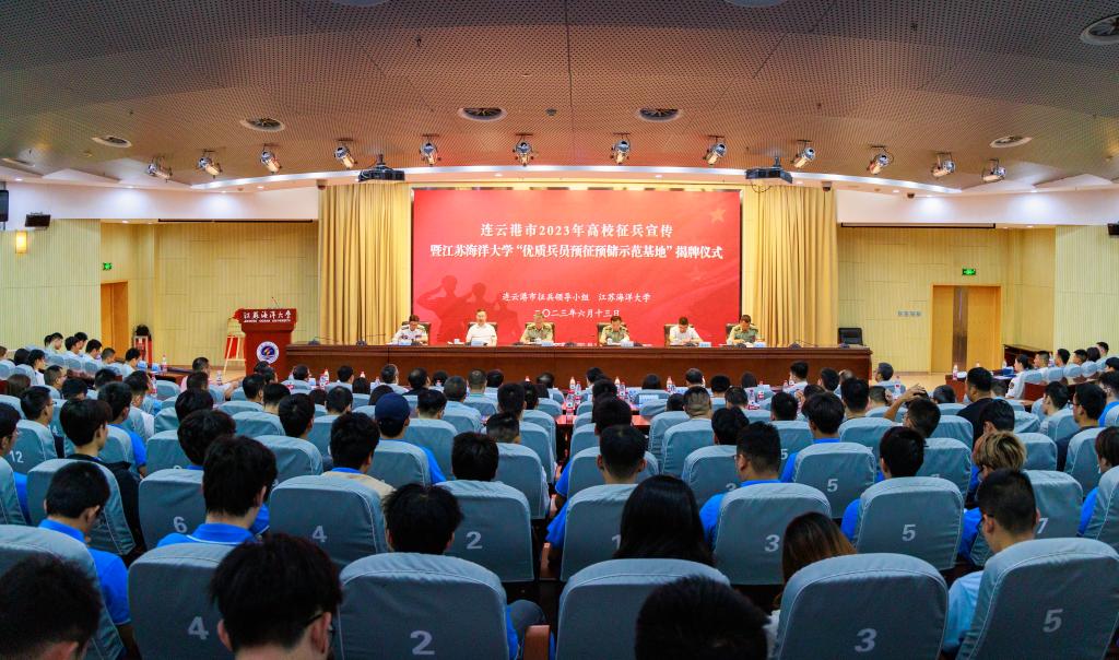 为深入贯彻落实中央军委国防动员部、教育部、人力资源和社会保障部、共青团中央联合印发的《关于印发<兵员预征预储工作暂行办法>的通知》精神,扎实做好兵员预征预储工作,进一步提高兵员征集质量,6月13日下午,连云港市2023年高校征兵宣传暨江苏海洋大学“优质兵员预征预储示范基地”揭牌仪式在我校隆重举行。连云港市委常委、连云港警备区司令员王先桥,我校校长宁晓明、副校长朱国军,连云港市征兵办主任、连云港警备区动员处处长姜齐,海州区人武部部长于程出席仪式。市、区教育局、人社局、团委领导,驻连各高校领导和300余名学生代表参加。揭牌仪式由连云港警备区政委李迎久主持。