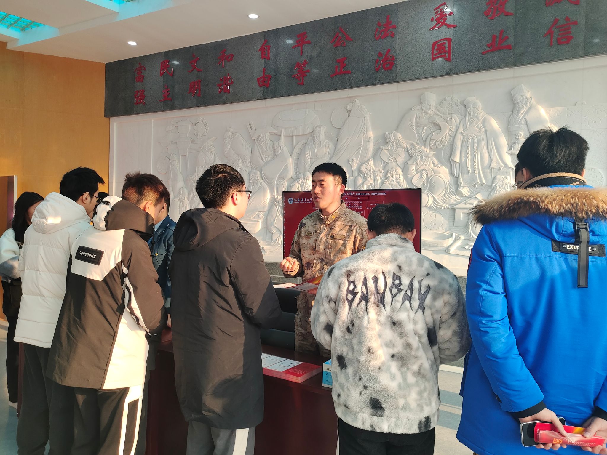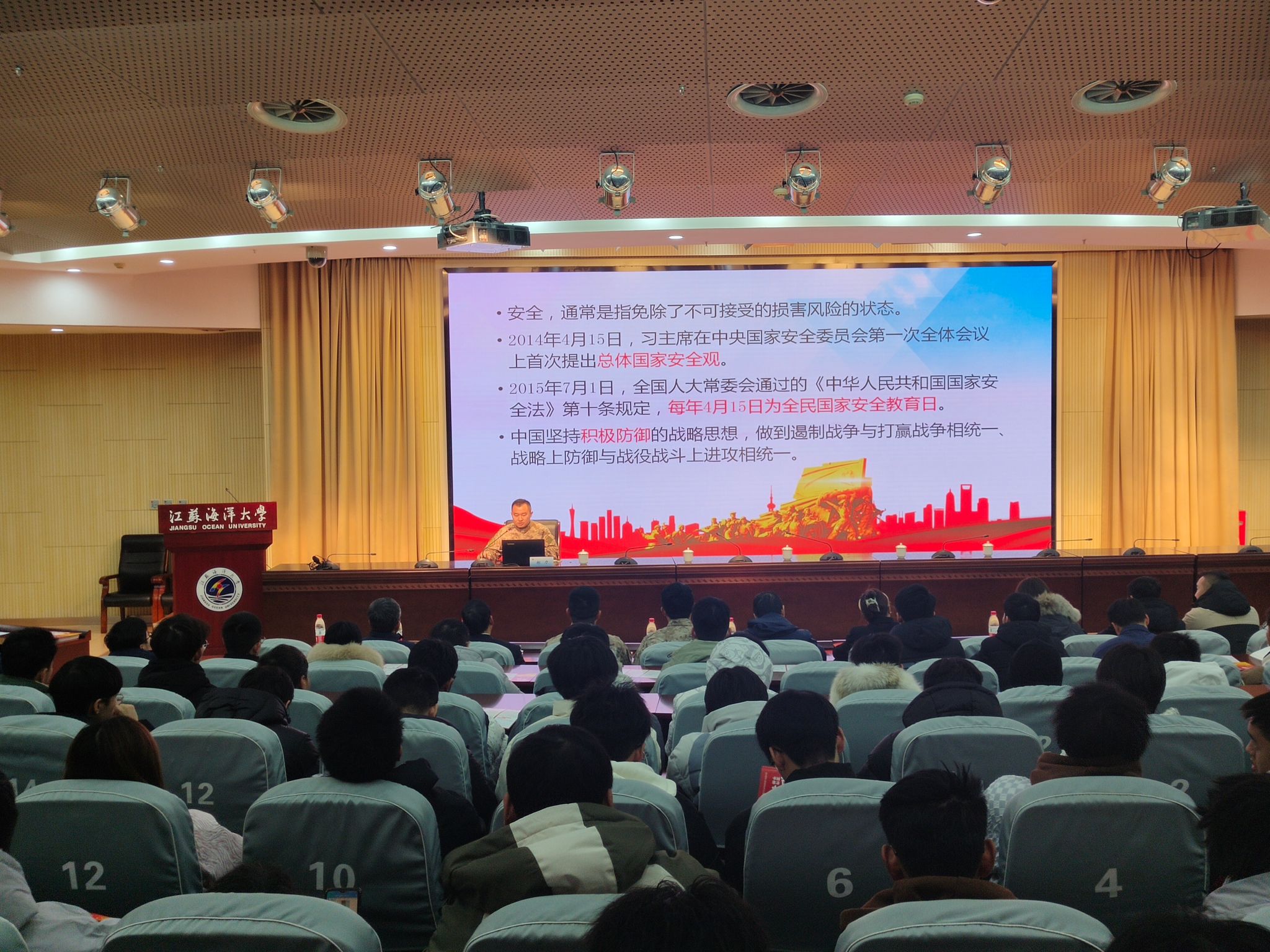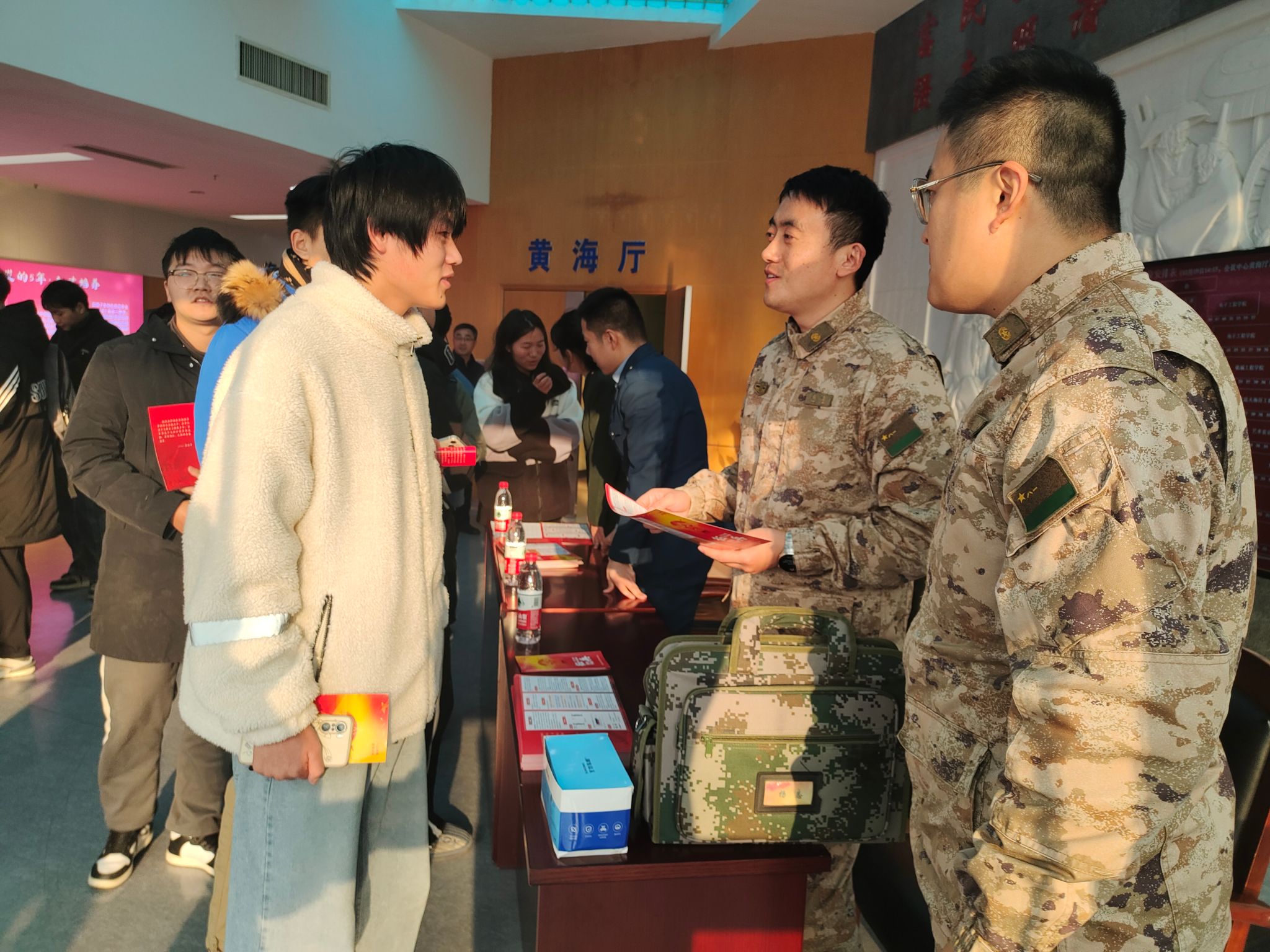 为加强国防教育,号召广大青年积极投身国防建设,12月19日下午,我校在会议中心黄海厅举行征兵宣传暨国防教育活动。海州区委常委、区人武部政委郝力,校人民武装部部长陈德翼,区人武部政治工作科科长杨志,区人武部军事科参谋庄洋出席活动。各学院征兵辅导员、有意向入伍的学生代表参加活动。活动由校人民武装部副部长张志浩主持。